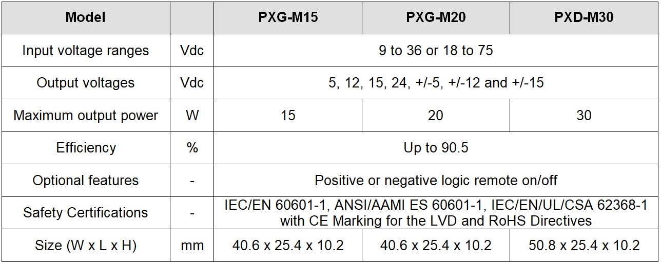 The PXG-M and PXD-M30 series have industry standard package sizes, with overall dimensions of 40.6 x 25.4 x 10.2 mm (1.6 x 1 x 0.4”) and 50.8 x 25.4 x 10.2 mm (2 x 1 x 0.4”) respectively. 5V, 12V, 15V and 24V single and +/-5V, +/-12V and +/-15V dual outputs are available in all three power levels. The single output models have an output adjustment function using a trim pin.